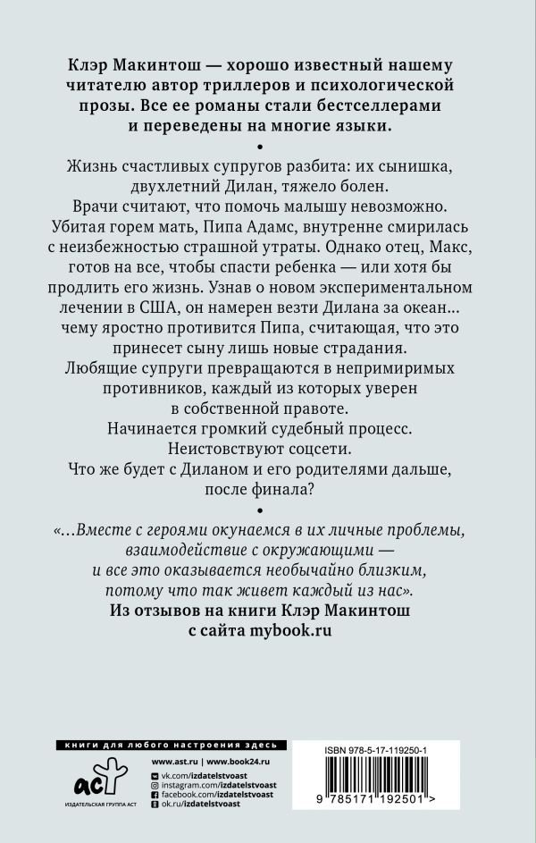 Убитая горем мать, Пипа Адамс, внутренне смирилась с неизбежностью страшной утраты. Однако отец, Макс, готов на всё, чтобы спасти ребенка — или хотя бы продлить его жизнь. Узнав о новом экспериментальном лечении в США, он намерен везти Дилана за океан... чему яростно противится Пипа, считающая, что это принесет сыну лишь новые страдания.