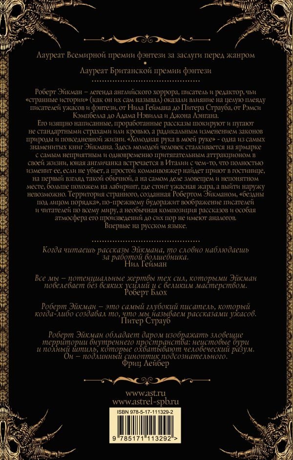 Его изящные, мастерски проработанные рассказы шокируют не обычными ужасами, а радикальным изменением законов самой природы. «Холодная рука в моей руке», один из самых известных и значимых сборников автора, издаётся на русском языке впервые.