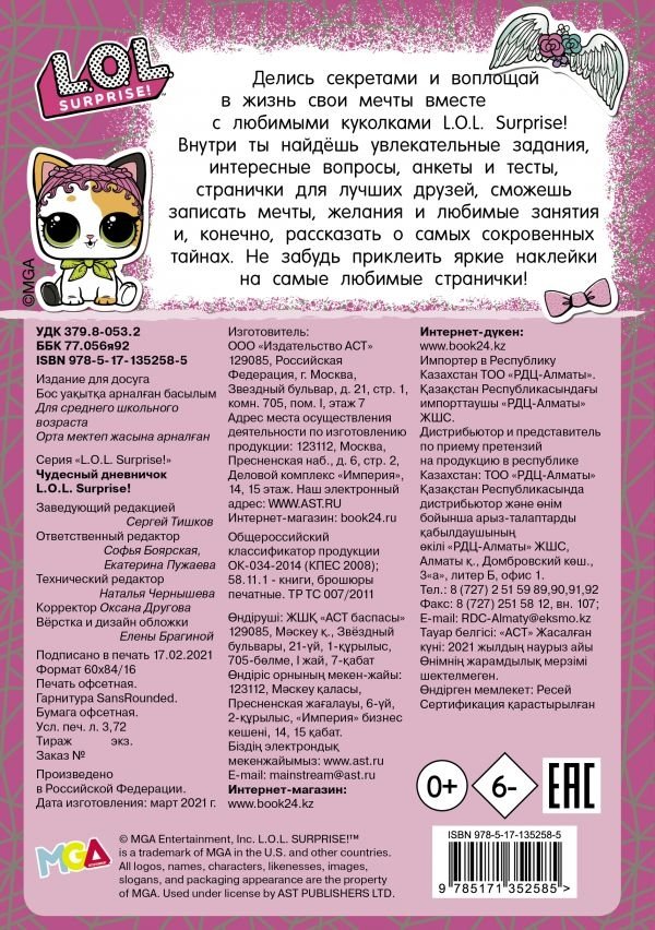 Делись секретами и воплощай в жизнь свои мечты вместе с любимыми куколками L.O.L. Surprise! Внутри ты найдёшь увлекательные задания, интересные вопросы, анкеты и тесты, странички для лучших друзей, сможешь записать мечты, желания и любимые занятия и, конечно, рассказать о самых сокровенных тайнах. Не забудь приклеить яркие наклейки на самые любимые странички!