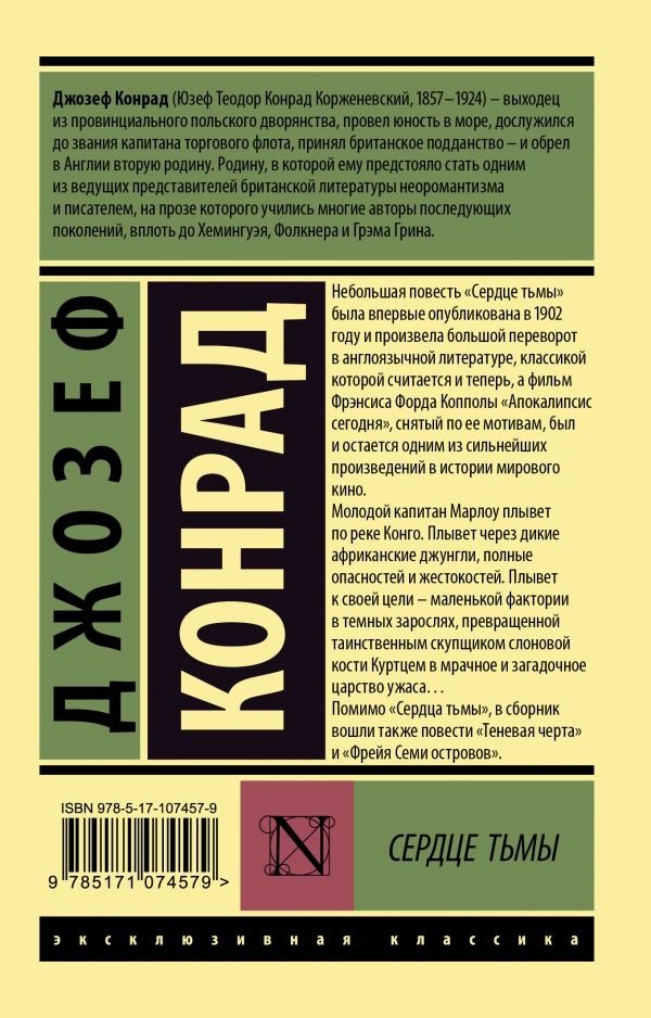 Небольшая повесть «Сердце тьмы» была впервые опубликована в 1902 году и произвела большой переворот в англоязычной литературе, классикой которой считается и теперь, а фильм Фрэнсиса Форда Копполы «Апокалипсис сегодня», снятый по ее мотивам, был и остается одним из самых сильнейших произведений в истории мирового кино.