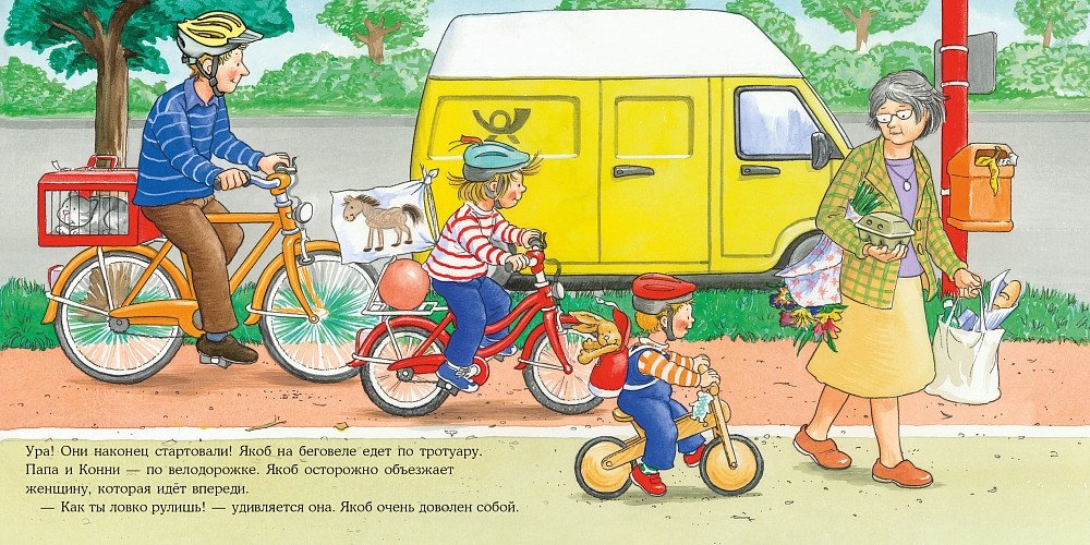 Сегодня Якоб с семьёй отправляется на пикник! Родители и старшая сестра Конни едут на велосипе-дах, а Якоб — на своём новеньком беговеле. Мама надевает на него яркий шлем, и Якоб уверенно рулит по тротуару. У него получается даже ловко объезжать пешеходов и вовремя тормозить!