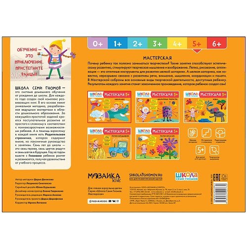 Книга «Аппликация 5+» из серии «Школа Семи Гномов. Мастерская» — это красочный альбом для занятий аппликацией с ребенком от 5 до 6 лет. Занятия на близкие и понятные ребенку темы расположены по мере усложнения: поступательно переходя от освоения простых навыков к более сложным заданиям, ребенок научится создавать аппликацию с помощью бумаги и клея.