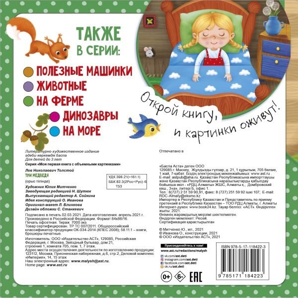 Герои любимой русской сказки теперь оживают! Яркие современные иллюстрации известной художницы Юлии Митченко дарят им совершенно новый образ. Эта книга не оставит равнодушным даже самого непоседливого малыша, благодаря выдвижным конструкциям на каждом развороте, ведь ребенок сам сможет принять участие в развитии сюжета - помочь девочке найти избушку трех медведей, поспать на каждой кровати, а еще - убежать от вернувшихся медведей.
