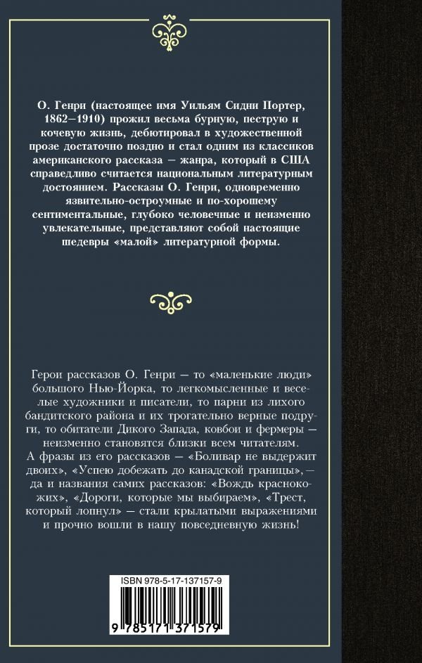 Герои рассказов О. Генри – то «маленькие люди» большого Нью-Йорка, то легкомысленные и веселые художники и писатели, то парни из лихого бандитского района и их трогательно верные подруги, то обитатели Дикого Запада, ковбои и фермеры – неизменно становятся близки всем читателям. А фразы из его рассказов – «Боливар не выдержит двоих», «Успею добежать до канадской границы», да и названия самих рассказов: «Вождь краснокожих», «Дороги, которые мы выбираем», «Трест, который лопнул» – стали крылатыми выражениями и прочно вошли в нашу повседневную жизнь!