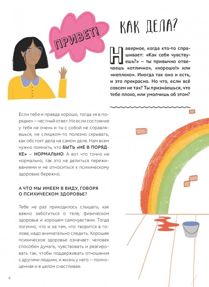 Подросток узнает, как распознать стресс, тревожность, негативные мысли, расстройство пищевого поведения, депрессию, СДВГ, перфекционизм, буллинг. И как помочь себе при помощи стойкости, осознанности, отдыха, заботы о себе, поддержки близких, добрых дел.