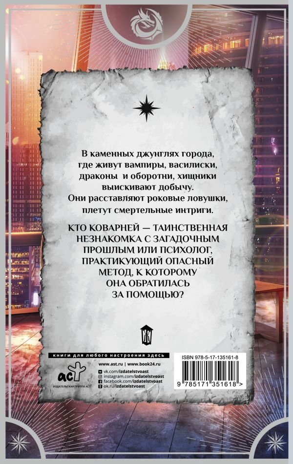 В каменных джунглях города, где живут вампиры, василиски, драконы и оборотни, любой может стать добычей хищника, попав в смертельную ловушку. Не стала исключением и главная героиня, у которой имеются тайна и личные демоны. Помочь ей способен только психолог, который практикует довольно опасный, но действенный метод. Однако и у него есть враги и причины держаться подальше от неприятностей в лице прекрасной пациентки. Обстановка накаляется, чувства искрят, вопросов становится все больше.