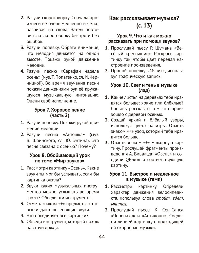 Рабочая тетрадь соответствует учебной программе по музыке и содержит разнообразные задания, направленные на развитие творческих способностей учащихся и формирование интереса к предмету. В пособии размещены QR-коды, с помощью которых первоклассники смогут послушать фрагменты музыкальных произведений и звуки природы, ознакомиться со звучанием музыкальных инструментов. На каждом уроке предусмотрена система самооценки.