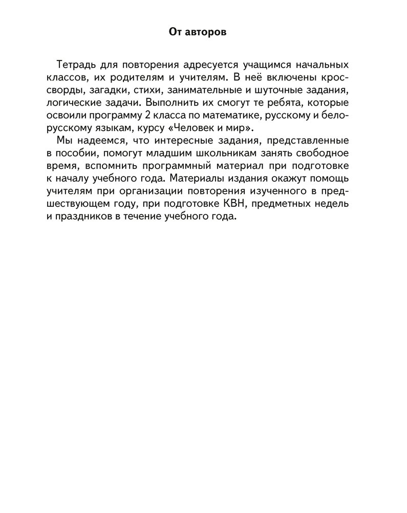 Тетрадь для повторения включает интересные и занимательные задания по предметам «Математика», «Русский язык», «Беларуская мова» и «Человек и мир». Ее материалы помогут школьникам занять свободное время, повторить изученное в прошедшем году и подготовиться к началу нового учебного года.