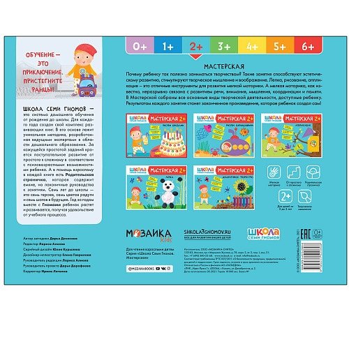 Книга «Рисуем красками 2+» из серии «Школа Семи Гномов. Мастерская» — это альбом для занятий рисованием с ребенком от 2 до 3 лет. Занятия на близкие и понятные ребенку темы расположены по мере усложнения: поступательно переходя от освоения простых навыков к более сложным заданиям, ребенок научится рисовать с помощью пальчиков и создавать красочные рисунки.
