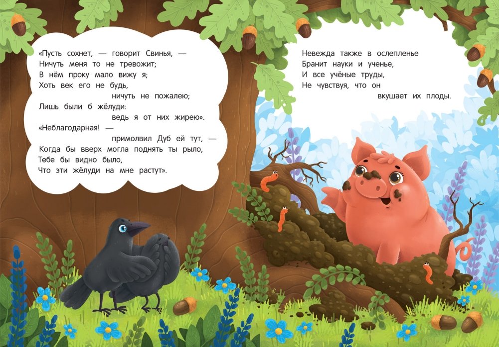 Серия картонных книг «Басни Крылова» благодаря ярким иллюстрациям и крупным буквам отлично подходит для чтения детям от двух лет.
