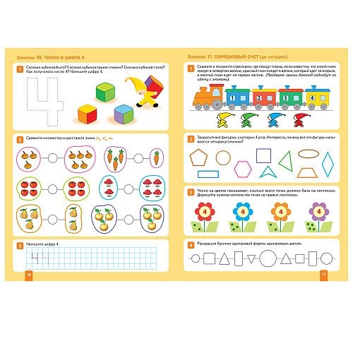 Выполняя занимательные упражнения и задания, предложенные в тетради, дети познакомятся с цифрами, научатся соотносить цифры с количеством предметов, сравнивать и объединять множества, работать со схемами, искать причинно-следственную связь между событиями, освоят порядковый счет в пределах 5. Усовершенствуют навыки ориентации на плоскости и определения направлений (налево, направо), сформируют временные представления.
