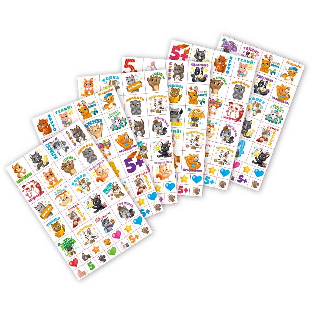 Яркие наклейки с изображением озорных котиков с поощрительными надписями помогут учителям, воспитателям детских садов и развивающих центров отметить старания ребят за правильно решенную задачу или аккуратно выполненное упражнение. Дополнительно прилагаются маленькие поощрительные наклейки в виде сердечек, оценок, звездочек и аплодисментов.