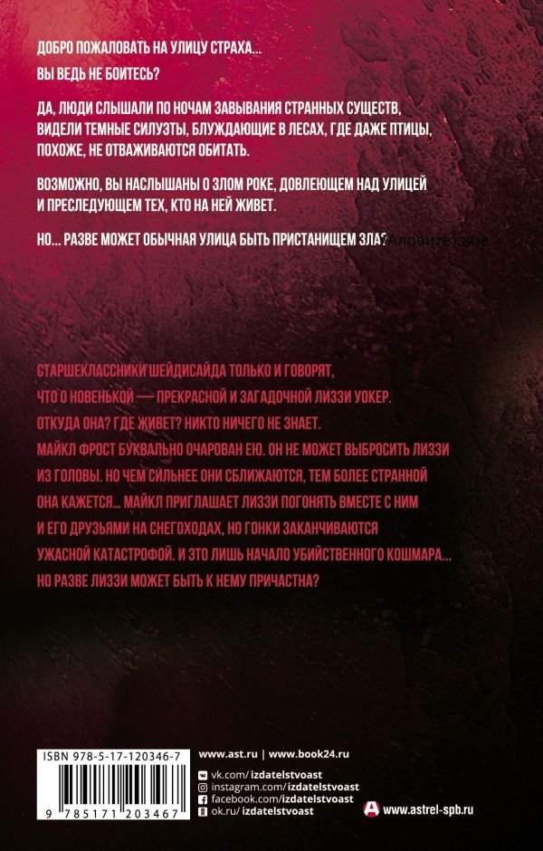 Старшеклассники Шейдисайда только и говорят, что о новенькой — прекрасной и загадочной Лиззи Уокер. Откуда она? Где живет? Никто ничего не знает. Майкл Фрост буквально очарован ею. Он не может выбросить Лиззи из головы. Но чем сильнее они сближаются, тем более странной она кажется… Майкл приглашает Лиззи погонять вместе с ним и его друзьями на снегоходах, но гонки заканчиваются ужасной катастрофой. И это лишь начало убийственного кошмара... Но разве Лиззи может быть к нему причастна?