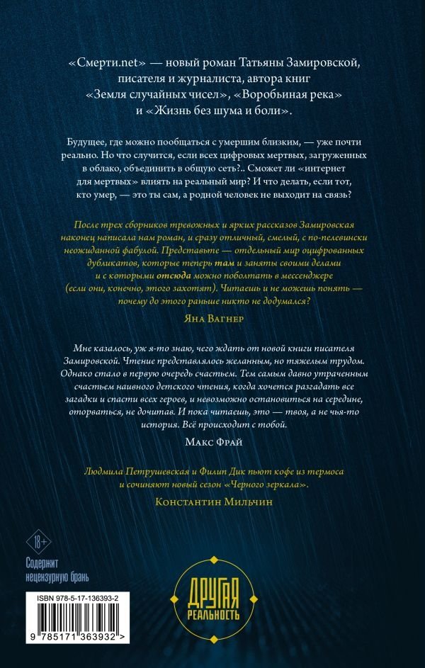 «Смерти.net» — новый роман Татьяны Замировской, писателя и журналиста, автора книг «Земля случайных чисел», «Воробьиная река» и «Жизнь без шума и боли».