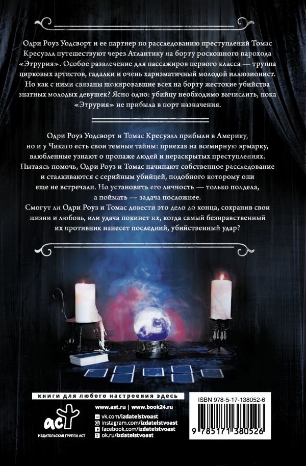 НОРМАЛЬНОСТЬ ПЕРЕОЦЕНЕНА. ОРИГИНАЛЬНОСТЬ НЕЗАБЫВАЕМА. Одри Роуз Уодсворт и ее партнер по расследованию преступлений Томас Кресуэлл путешествуют через Атлантику на борту роскошного парохода "Этрурия". Особое развлечение для пассажиров первого класса — труппа цирковых артистов, гадалок и очень харизматичный молодой иллюзионист. Но как с ними связаны шокировавшие всех на борту жестокие убийства знатных молодых девушек? Ясно одно: убийцу необходимо вычислить, пока "Этрурия" не прибыла в порт назначения.