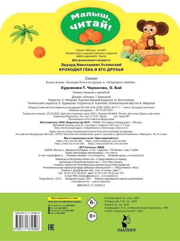 В книгу для самостоятельного чтения с большими буквами вошли две сказки Эдуарда Успенского – "Крокодил Гена и его друзья" (рис. Т. Черкасовой) и "Чебурашка и змейчик" (рис. О. Бай). Это короткие истории о том, как встретились и подружились Чебурашка и Гена с другими героями сказки, и о том, как храбрый и умный Чебурашка сумел помочь сразу двум семьям с маленькими детьми.