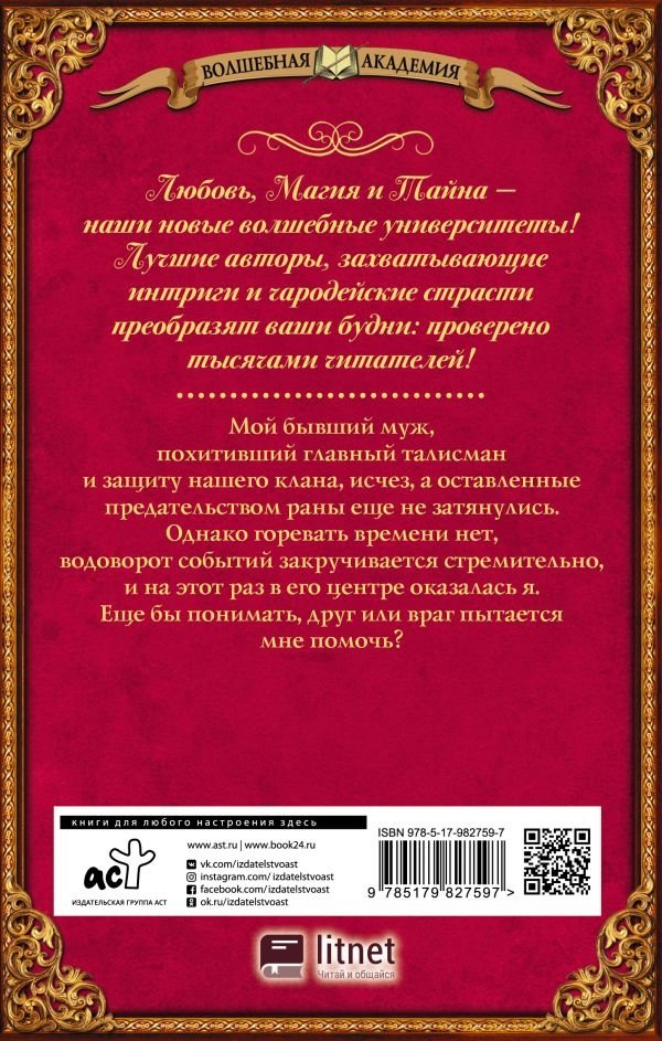 Однако Сатьяна не намерена сдаваться. Ей хватит силы воли и целеустремленности, чтобы отстоять собственные желания. Помочь ей в этом может один странный студент, который неприятен в общении, но в котором все-таки есть и капля благородства. Мой бывший муж, похитивший главный талисман и защиту нашего клана, исчез, а оставленные предательством раны еще не затянулись. Однако горевать времени нет, водоворот событий закручивается стремительно, и на этот раз в его центре оказалась я. Еще бы понимать, друг или враг пытается мне помочь?