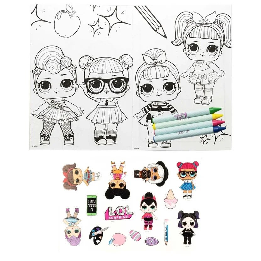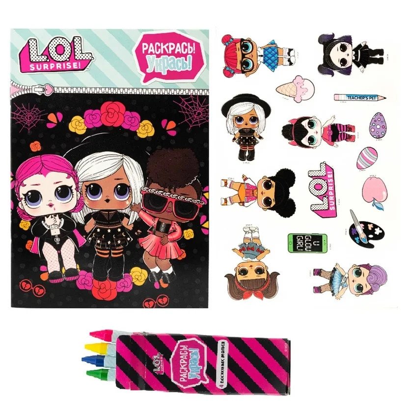Приготовься! У куколок L.O.L. для тебя подарок - серия ярких наборов "Укрась! Раскрась!". В каждой упаковке тебя ждут раскраски и задания с героинями из разных серий, цветные наклейки и восковые мелки. А чтобы все это не потерялось, мы придумали надежную застежку-молнию, теперь любимые героини могут путешествовать с тобой куда угодно. Комплектация: раскраска с заданиями - 8 страниц, 4 восковых мелка, лист наклеек 12x17 см.