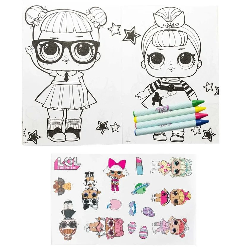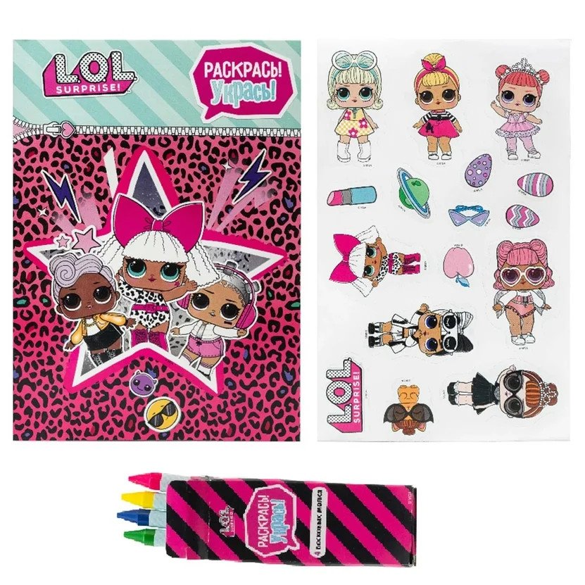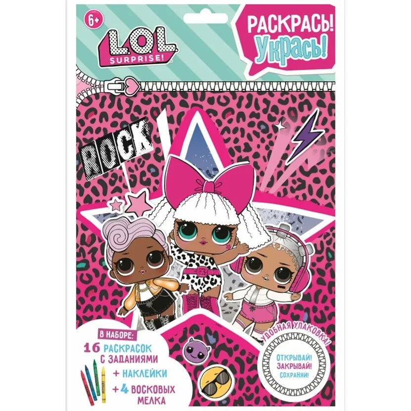 Приготовься! У куколок L.O.L. для тебя подарок - серия ярких наборов "Укрась! Раскрась!". В каждой упаковке тебя ждут раскраски и задания с героинями из разных серий, цветные наклейки и восковые мелки. А чтобы все это не потерялось, мы придумали надежную застежку-молнию, теперь любимые героини могут путешествовать с тобой куда угодно. Комплектация: раскраска с заданиями - 8 страниц, 4 восковых мелка, лист наклеек 12x17 см.
