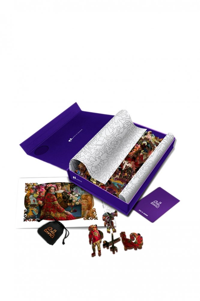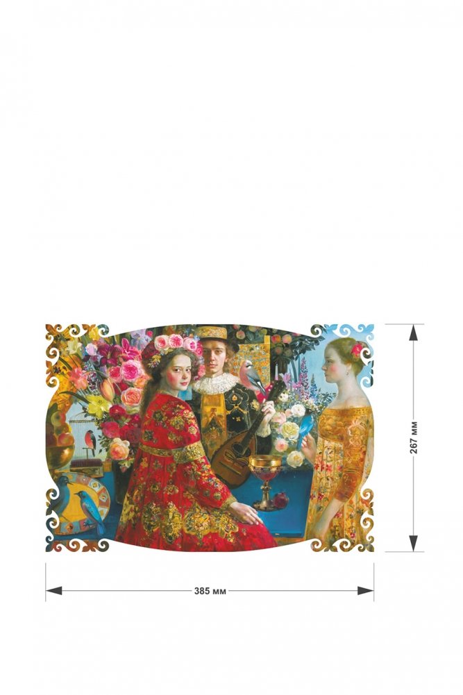 За цветами и геометрией узоров парадного портрета скрыты истории дам и кавалеров из галантного и изысканного столетия. Фигурный рез пазла подобен музею эпохи: внутри цветочного орнамента скрыты герои творений Рембрандта. Цветочные орнаменты по всему периметру набора изящно венчают сюжетную линию картины. Внутри набора в истории жизни эпохи дам и кавалеров - в динамичном сюжете из дуэлей и любовных драм.