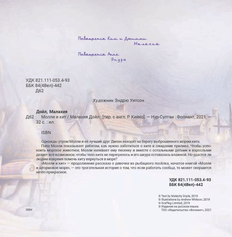 «Молли и кит» — продолжение рассказа о девочке из рыбацкого посёлка, начатое книгой «Молли и штормовое море», — это трогательная история о том, что если работать сообща, то может свершится нечто прекрасное.