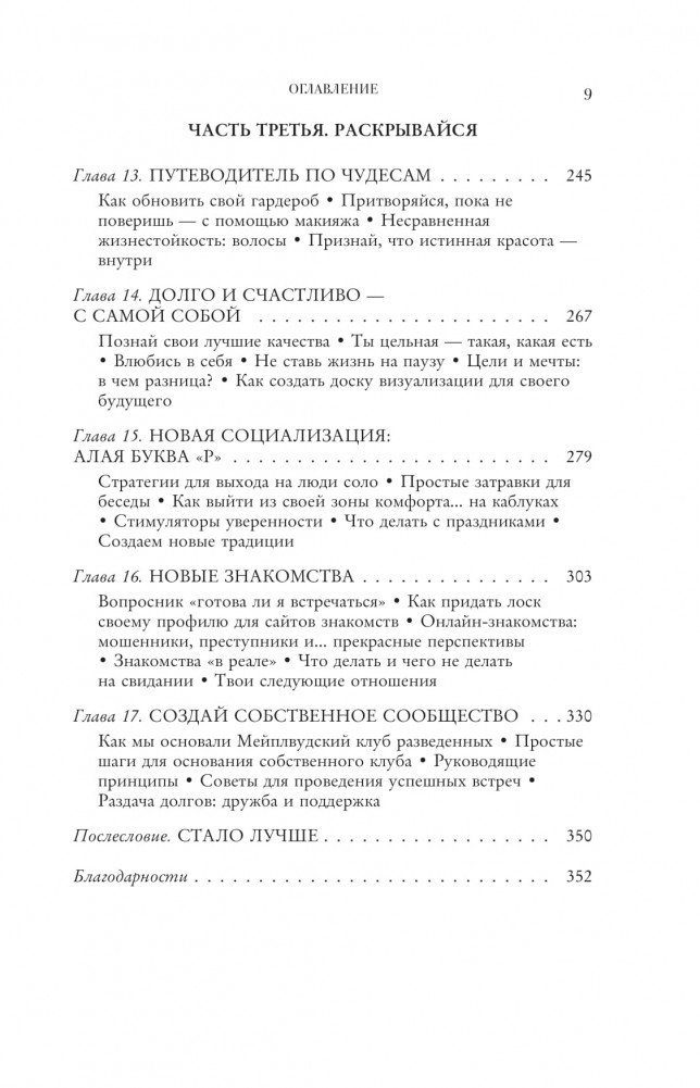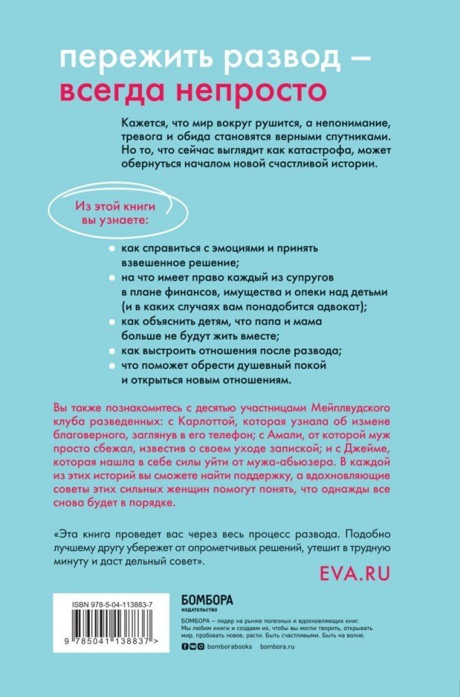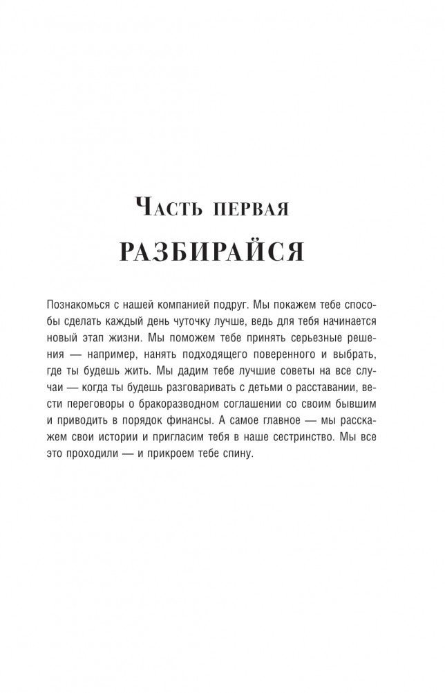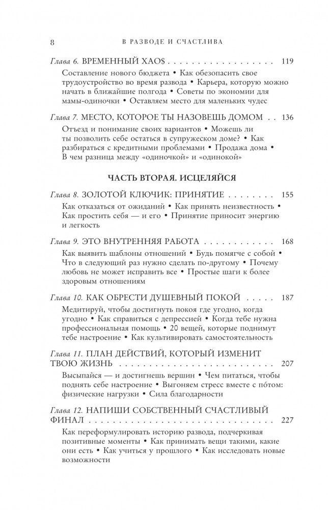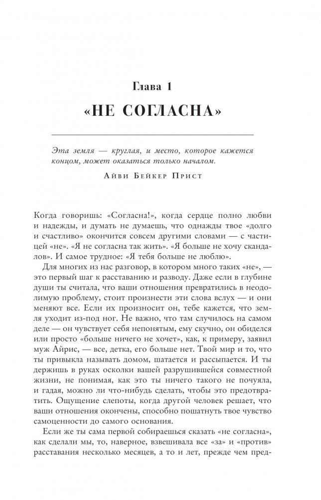 По статистике чаще всего на развод подают женщины. Это тяжелое решение помимо облегчения, приносит также боль, потерянность и одиночество. Героини данной книги тоже прошли через мучительное расставание, но нашли в себе силы жить дальше и стать счастливыми. Внутри вы найдете пошаговый план для начала нового этапа жизни. Узнаете, как поговорить с детьми о расставании, вести переговоры о расторжении брака со своим бывшим, привести финансы в порядок и многое другое. Вы научитесь находить радость, добиваться самореализации и ощущать безмятежное спокойствие даже в непростые времена развода. В издание включены комментарии российского адвоката, Екатерины Калядиной, в которых она разъясняет нюансы бракоразводного процесса в России.