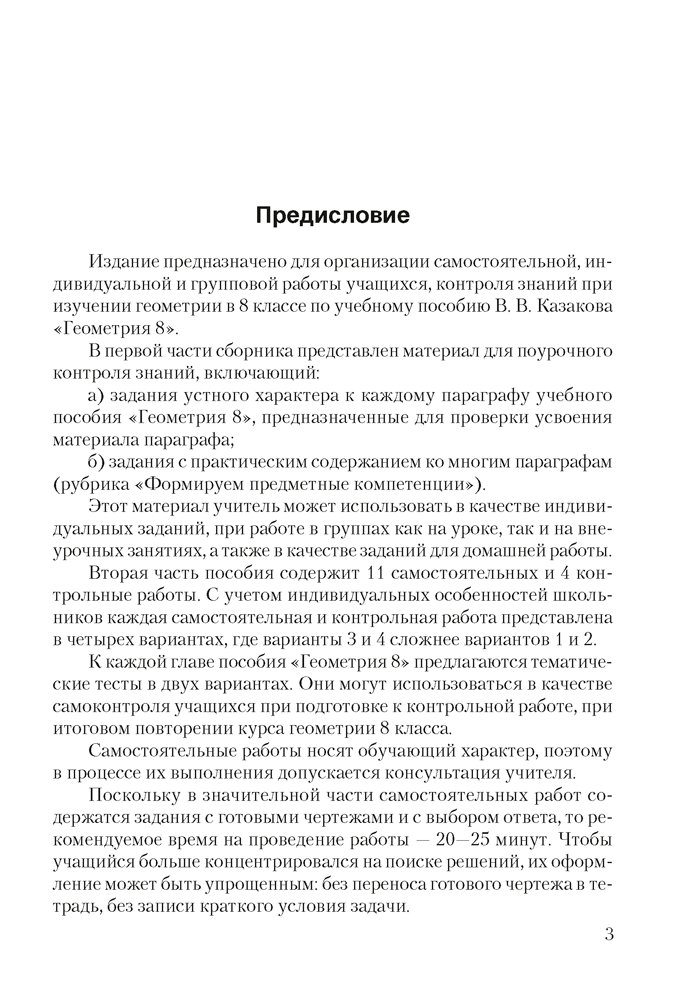 В пособии представлены контрольно-измерительные материалы, которые составлены в соответствии с основными требованиями к результатам учебной деятельности учащихся, определенными действующей учебной программой, и структурированы в соответствии с учебным пособием «Геометрия» для 8 класса авторов В. В. Казакова, О. О. Казаковой.