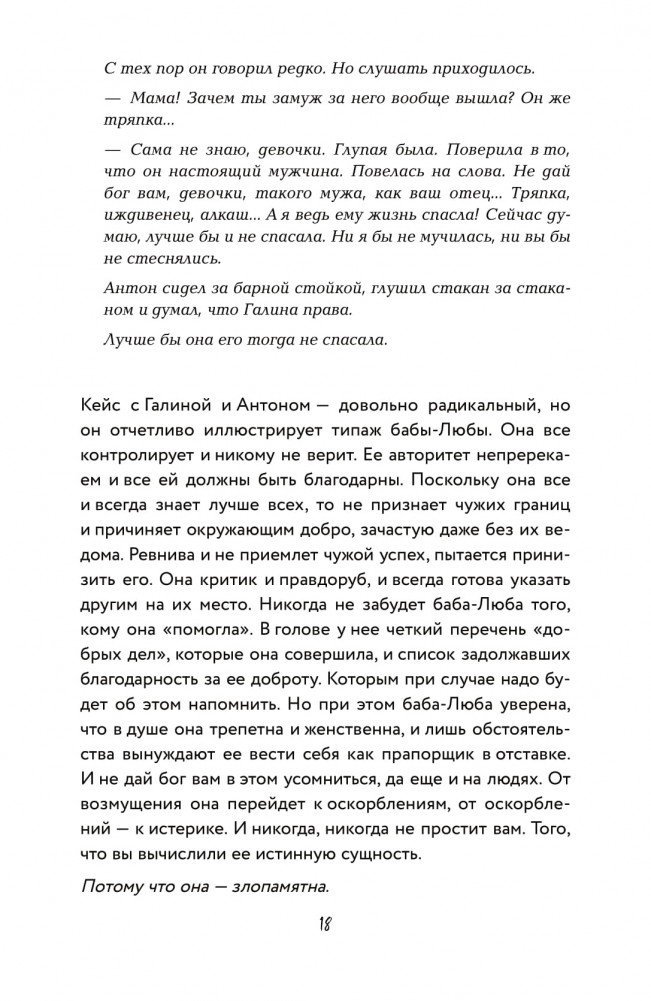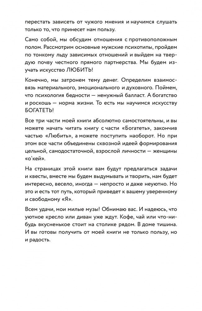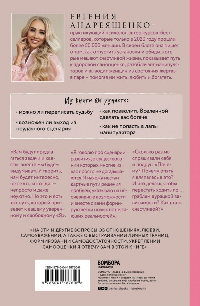 Психолог Евгения Андреященко рассказывает, как избавиться от тех внутренних блоков, которые стоят на пути изобильной и полной жизни. "Почему я постоянно попадаю в одну и ту же ситуацию?", "Что делать, чтобы перестать ходить по граблям зависимости?", "Как стать счастливой"? Автор отвечает на вопросы об отношениях, любви, самоуважении, а также о выстраивании личных границ, формировании самодостаточности и укреплении самооценки.