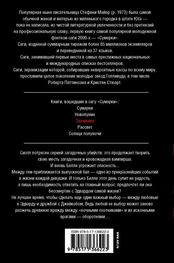 Вашему вниманию предлагается специальное переиздание в новом оформлении, приуроченном к выходу «Солнца полуночи», новой книги цикла. Соберите всю сагу в едином оформлении! Сиэтл потрясен серией загадочных убийств: это продолжает творить свою месть загадочная и кровожадная вампирша. И вновь Белле угрожает опасность...