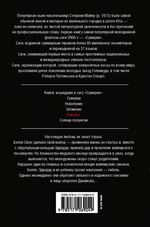 История любви обычной старшеклассницы и необычного вампира покорила сердца миллионов людей. Стефани Майер, создательница саги «Сумерки», два года подряд признавалась лучшей писательницей США, её книги были переведены на 38 языков, а общий тираж «Сумеречной саги» превышает 150 000 000 экземпляров. Сага легла в основу одноимённой киносерии с Робертом Паттисоном и Кристен Стюарт в главных ролях, пять фильмов цикла заработали в мировом прокате свыше 4 миллиардов долларов.