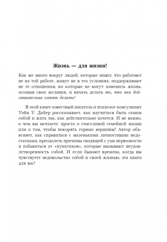 Уэйн Дайер помог тысячам людей выявить их зоны ошибок и научиться обходить ловушки мышления, приводящие к неудовлетворенности собой. Если вы хотите поднять самооценку, стать уверенными в себе и счастливыми, эта книга перевернет все ваше мировоззрение, научит любить самих себя такими, какие вы есть, и получать от жизни только радость и удовольствие.