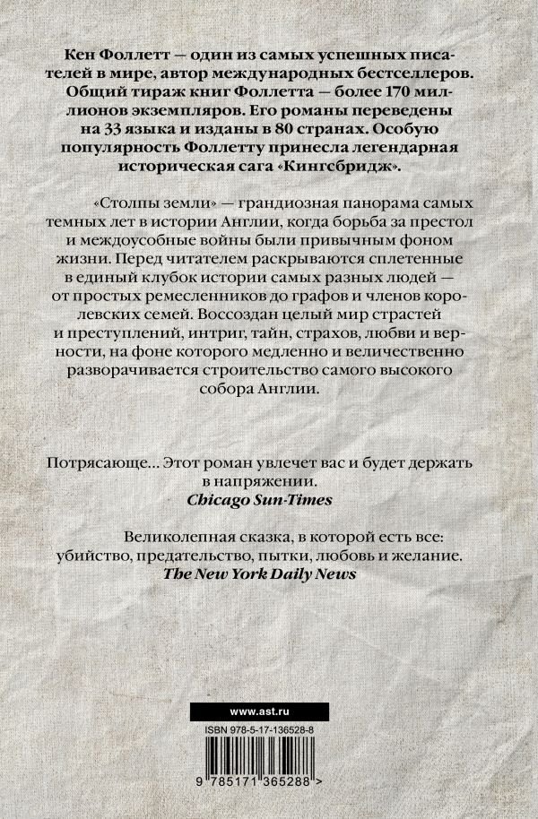 "Столпы земли" - грандиозная панорама самых темных лет в истории Англии, когда борьба за престол и междоусобные войны были привычным фоном жизни. Перед читателем раскрываются сплетенные в единый клубок истории самых разных людей - от простых ремесленников до графов и членов королевских семей. Воссоздан целый мир страстей и преступлений, интриг, тайн, страхов, любви и верности, на фоне которого медленно и величественно разворачивается строительство самого высокого собора в Англии.