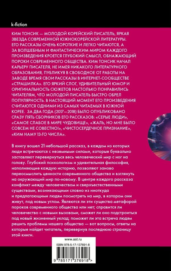 Захватывающие рассказы корейского молодого писателя Ким Тонсика, вошедшие в сборник, перевернут ваши взгляды на современное общество и на тот мир, в котором мы живем. Основной конфликт каждой истории в том, что человечество внезапно сталкивается с чудовищами, инопланетянами или демонами, которые предлагают им какие-либо неземные способности. Человечество же, соглашаясь на такие условия, зачастую не понимает, что кроется за ними. Будет ли это катастрофа для современного общества либо невероятная выгода - вот вопрос на который нам предстоит ответить.