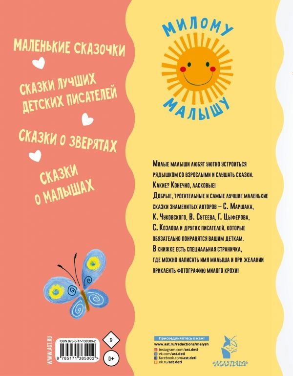 В книгу «Ласковые сказки» вошли самые трогательные сказки знаменитых писателей — С. Маршака, К. Чуковского, Э. Успенского, С. Козлова, Т. Александровой и других авторов, которые так понимают милых малышей, что пишут для них особые, маленькие, произведения. В книге очень много больших и ярких картинок, которые так интересно рассматривать, пока взрослые читают деткам про ребят и зверят. Не забудьте подписать эту книжку именем вашей крохи и, при желании, вклеить фотографию на первой страничке. Приятного чтения.