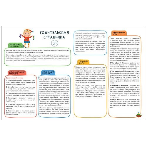 Книга «Логика, мышление 3+» из серии «Школа Семи Гномов. Активити с наклейками» предназначена для развития и тренировки логического мышления детей от 3 до 4 лет.