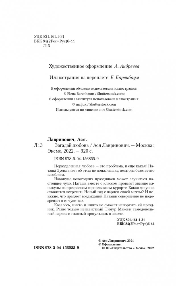 Впервые! Эксклюзив! Праздничная новогодняя новинка от Аси Лавринович! Неразделенная любовь — это проблема, и еще какая! Наташа Зуева знает об этом не понаслышке, ведь она безответно влюблена. Накануне новогодних праздников может случиться настоящее чудо. Наташа вместе с классом проведет зимние каникулы на прекрасном горнолыжном курорте. Какая девушка откажется встретить Новый год с парнем своей мечты? И неважно, что предмет воздыханий Наташи совершенно не подозревает о ее чувствах. Казалось, никто и ничто не сможет испортить ей праздник. Разве только ненавистный Тимур Макеев, самодовольный парень и главный прогульщик в школе. Ася Лавринович — один из самых популярных молодежных авторов. Суммарный тираж ее книг составляет более 100 000 экземпляров.