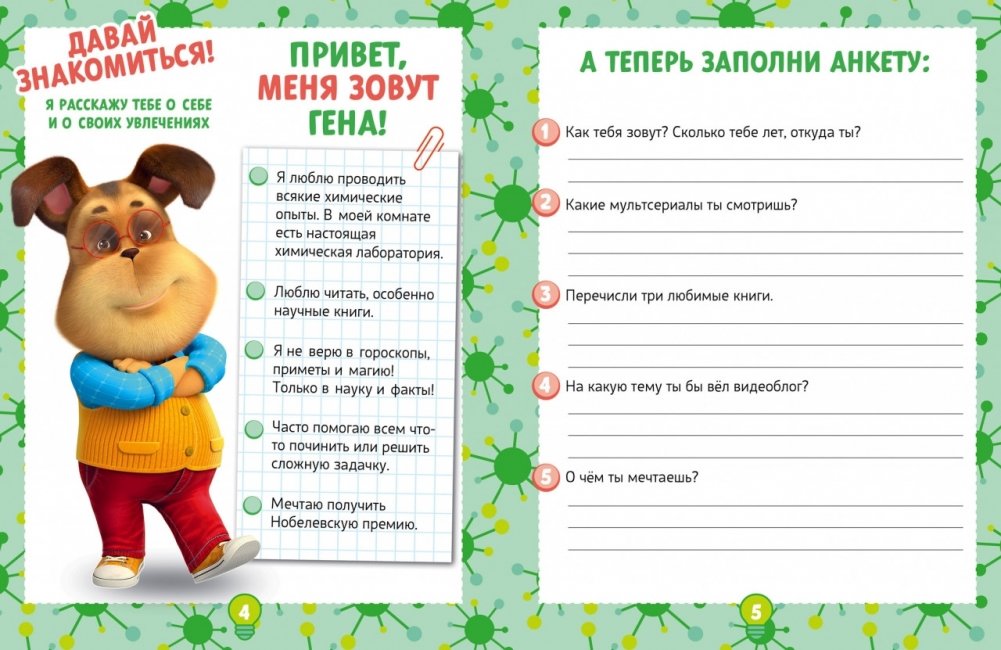 Гена Барбоскин – настоящий учёный. Он любит читать научные книги, ставит эксперименты и доверяет только проверенным фактам. Может быть, тебя тоже интересуют опыты и исследования? Тогда заполни эту хобби-тетрадь вместе с Геной и раскрой секреты разных наук! Эта тетрадь расскажет тебе об открытиях, которые изменили мир, о важных научных наградах, а также об учёных и их необычных хобби. Ты понаблюдаешь за космосом и заглянешь в будущее. Вместе с Геной приготовишь полезный «умный» завтрак, сделаешь зарядку для ленивых и научишься вязать шарф. А ещё тебя ждут интересные тесты, игры, головоломки и эксперименты!