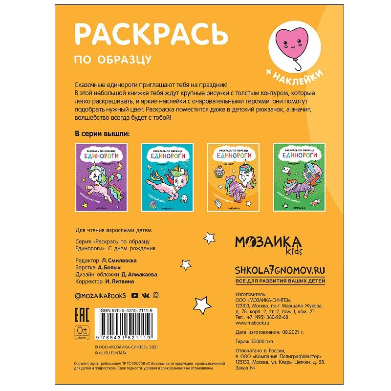 Вам хотелось бы побывать на волшебном празднике? Что ж, приглашаем в путешествие по страницам книжки, созданной специально для маленьких художников, которые верят в чудеса. В ней вас ждут 8 симпатичных картинок с крупными наклейками-подсказками — они помогут ребенку с выбором цвета. Раскрашивая сказочных героев, он весело и с пользой проведет время дома, в гостях, в дороге — где угодно: книжки небольшого формата легко поместятся даже в детский рюкзачок. Занятия с книжками серии «Раскрась по образцу. Единороги» не только способствуют развитию творческих способностей, внимания и мелкой моторики.