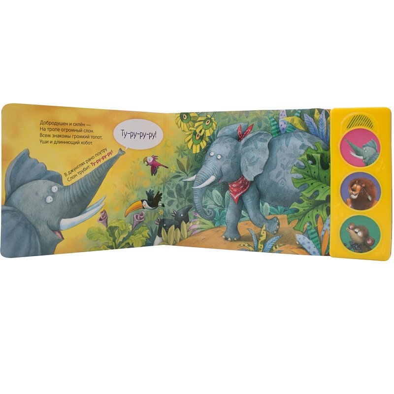 Ту-ру-ру-ру! Р-р-р-р! Ух-у! Звуковые книги любят все малыши — так интересно нажимать на кнопки и слушать разные звуки. Книга «В Африке» из серии «Нажми и послушай» с выразительными иллюстрациями Любови Ерёминой и веселыми стихами расскажет о животных Африки. Малыш отправится на водопой вместе с львом, слоном и обезьянкой. В книге 3 звуковые кнопки, нажимая на которые, можно услышать звуки животных. Звук можно выключить повторным нажатием на кнопку.