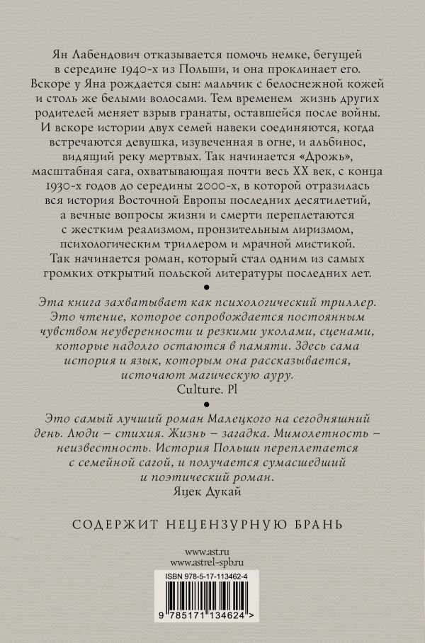 Ян Лабендович отказывается помочь немке, бегущей в середине 1940-х из Польши, и она проклинает его. Вскоре у Яна рождается сын: мальчик с белоснежной кожей и столь же белыми волосами. Тем временем жизнь других родителей меняет взрыв гранаты, оставшейся после войны. И вскоре истории двух семей навеки соединяются, когда встречаются девушка, изувеченная в огне, и альбинос, видящий реку мертвых. Так начинается «Дрожь», масштабная сага, охватывающая почти весь XX век, с конца 1930-х годов до середины 2000-х, в которой отразилась вся история Восточной Европы последних десятилетий, а вечные вопросы жизни и смерти пере плетаются с жестким реализмом, пронзительным лиризмом, психологическим триллером и мрачной мистикой. Так начинается роман, который стал одним из самых громких открытий польской литературы последних лет.