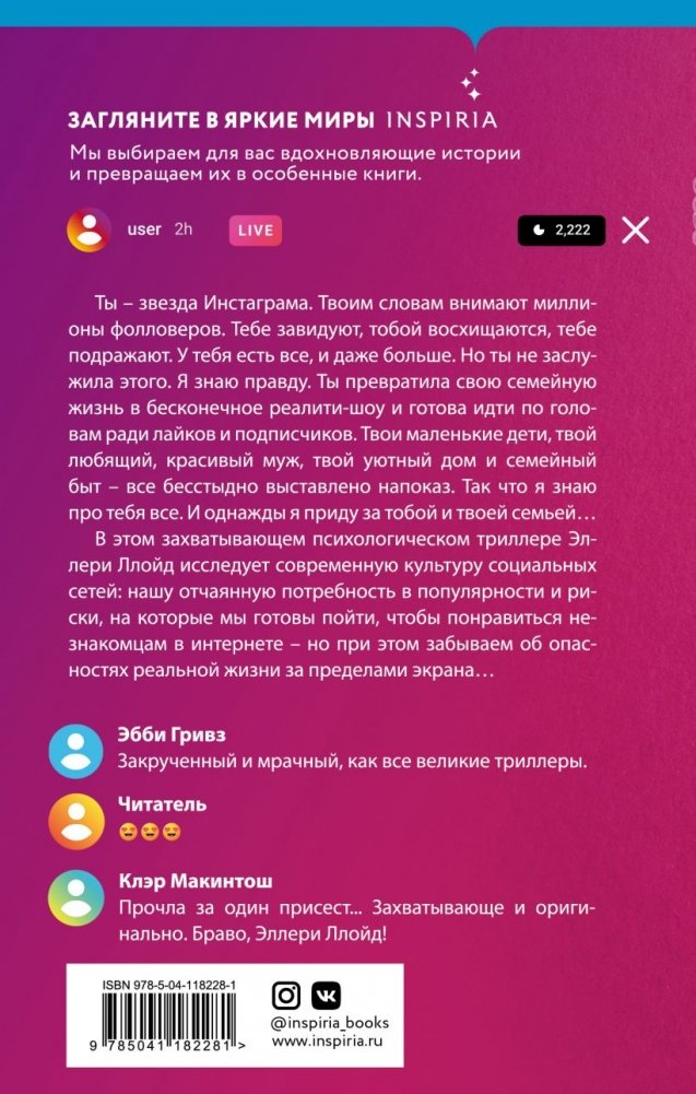Ты – звезда Инстаграма. Твоим словам внимают миллионы фолловеров. Тебе завидуют, тобой восхищаются, тебе подражают. У тебя есть все и даже больше. Но ты не заслужила этого. Я знаю правду. Ты превратила свою семейную жизнь в бесконечное реалити-шоу и готова идти по головам ради лайков и подписчиков. Твои маленькие дети, твой любящий, красивый муж, твой уютный дом и семейный быт – все бесстыдно выставлено напоказ. Так что я знаю про тебя все. И однажды я приду за тобой и твоей семьей… В этом захватывающем психологическом триллере Эллери Ллойд исследует современную культуру социальных сетей: нашу отчаянную потребность в популярности и риски, на которые мы готовы пойти, чтобы понравиться незнакомцам в интернете - но при этом забываем об опасностях реальной жизни за пределами экрана…