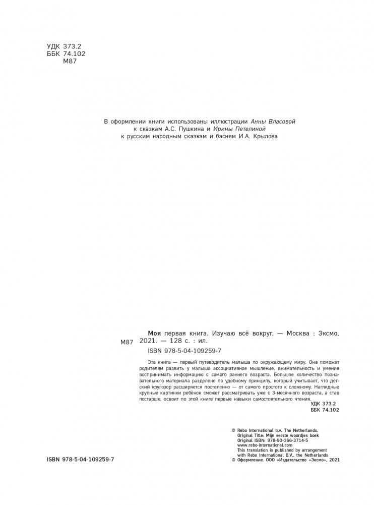 Одна книга — много умений! «Моя первая книга. Изучаю всё вокруг» — это отличный помощник для родителей, которые хотят своевременно и качественно заняться развитием своего малыша. Большое количество познавательного материала разделено по удобному принципу, который учитывает, что детский кругозор расширяется постепенно — от самого простого к сложному. Яркие крупные фотоиллюстрации можно рассматривать уже с 3-месячного возраста. Они помогут малышу сформировать правильное представление об объектах окружающего мира и научиться узнавать их вокруг себя. Родители найдут в книге ряд полезных советов, которые помогут им быстрее развить у малыша самостоятельную речь. И это ещё не всё: в более старшем возрасте по этой книге дети смогут учиться читать!