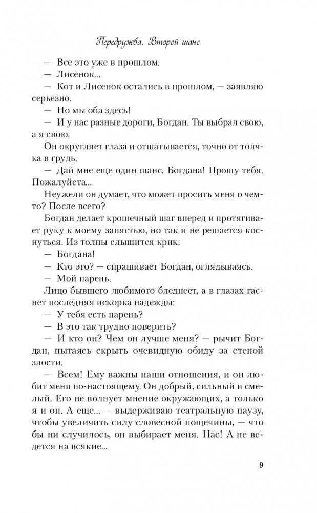 Прошло больше двух лет после окончания школы. За это время Богдана Лисецкая ни разу не пожалела о сделанном выборе. Ее студенческая жизнь наполнена яркими событиями, новые друзья не дают скучать, а старые предусмотрительно не напоминают о прошлом. Пока оно само не стучит в закрытую дверь: это снова он, Богдан — лучший друг и ее первая любовь. Декорации изменились, Кот и Лисенок повзрослели, но они все еще не поняли, что все-таки между ними произошло? Заслуживает ли передружба второго шанса или стоит просто зачеркнуть приставку пере-, оставив лишь... дружбу?