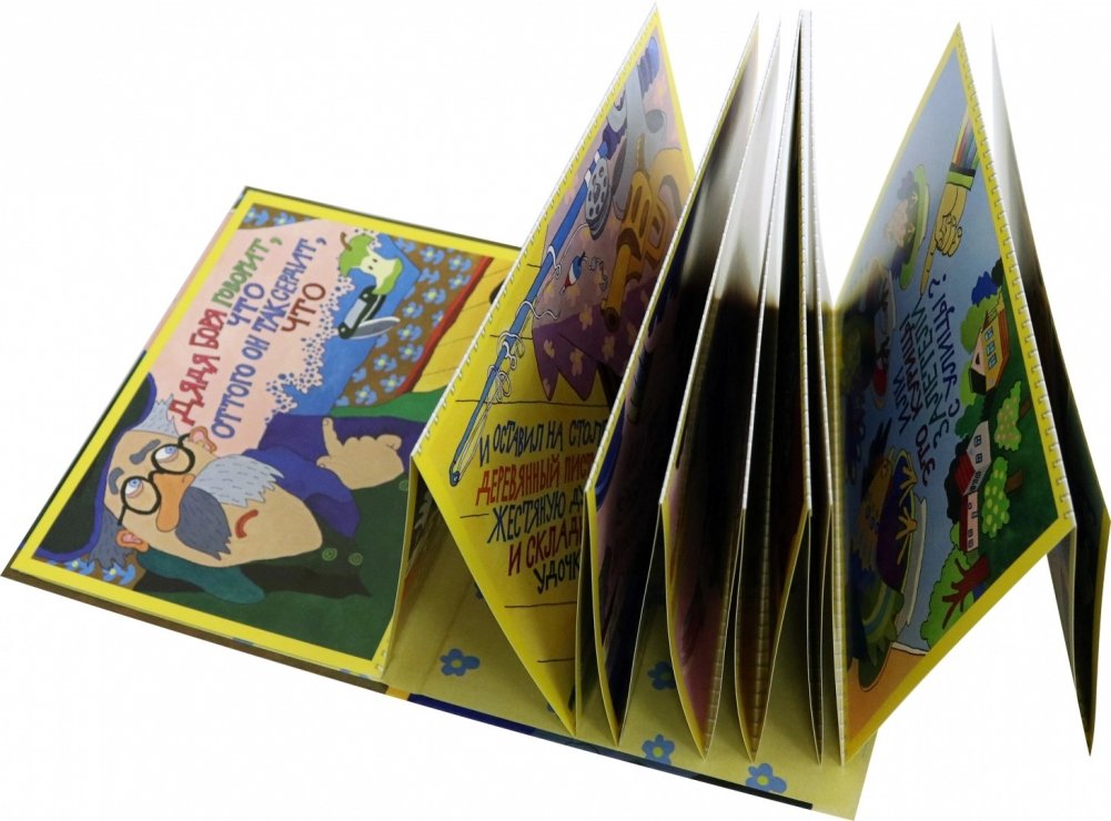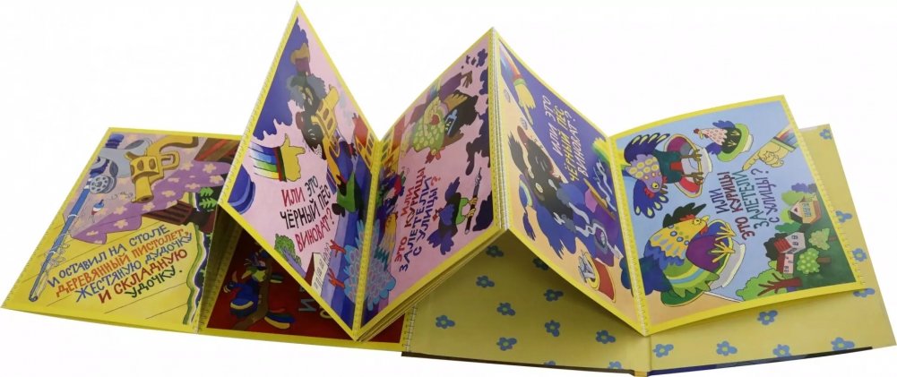 В книге так много забавного и абсурдного! Со страницы на страницу перетекают необычные рисунки, их можно рассматривать как маленький мультфильм или настенный витраж из цветных стёклышек. Ребёнку несомненно понравится разворачивать книгу, следуя за ее историей и героями!