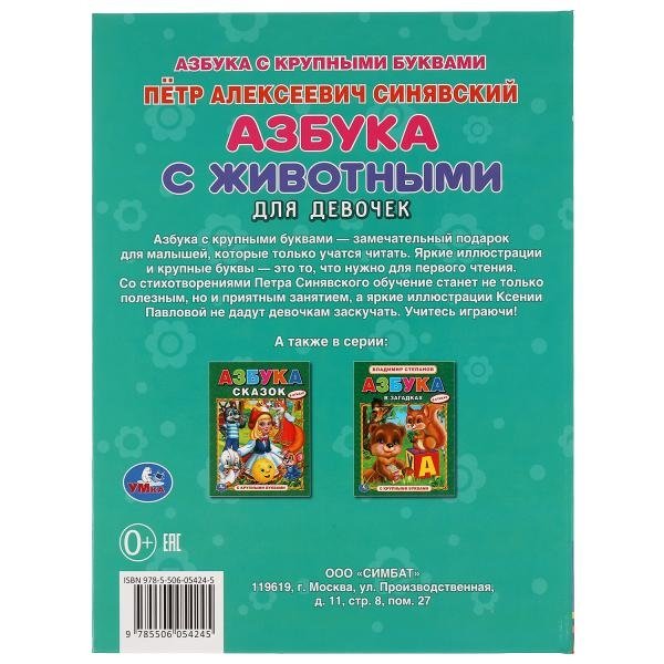 Книга с крупными буквами «Пётр Синявский. Азбука животных для девочек (в стихах)» ТМ «УМка» превратит обучение в увлекательную игру: