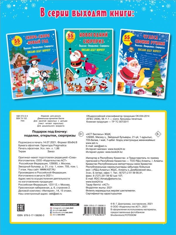 Книжка-мастерилка — это отличная возможность своими руками сделать для родных и друзей праздничные сюрпризы: смастерить гирлянды и ёлочные украшения, придумать необычные новогодние открытки, вырезать снежинки. И конечно, каждый постарается написать письмо Деду Морозу и Снегурочке, расскажет о своих мечтах — и чудо обязательно произойдёт!