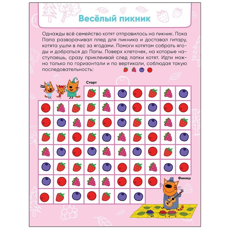 В книге «Веселые путешествия» ребенка ждут занимательные лабиринты, посвященные путешествиям на суше, на море и в воздухе. Это отличный способ расширить представления малыша о мире. А еще на каждой страничке — веселая история про приключения котят и их друзей, а также задание, которое нужно выполнить при помощи наклеек. Проходя лабиринты и приклеивая наклейки, незаметно для себя малыш потренирует внимание, мелкую моторику и мышление. Только вперед! Миу-миу-миу!