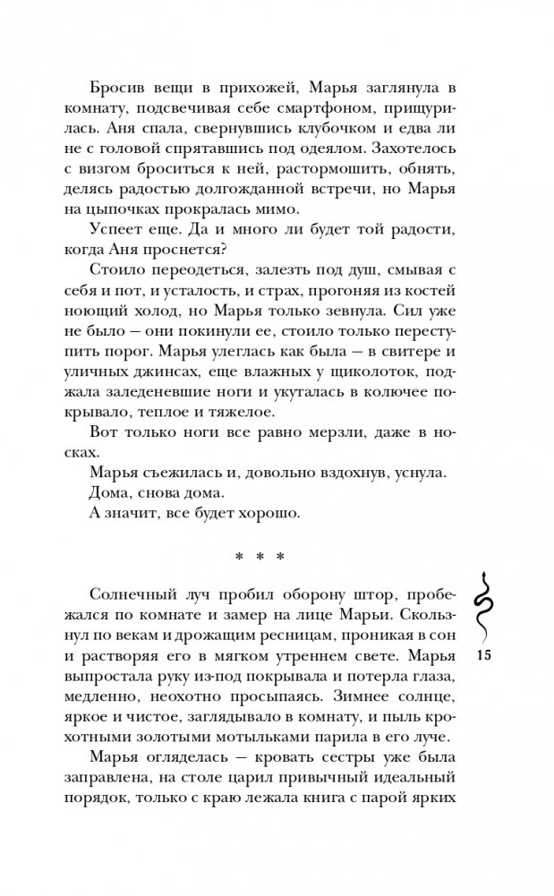 Не верьте, что сказки заканчиваются по-доброму. Они обращаются мраком. Даже спустя несколько лет после возвращения из Нави, сестры замечают странные тени и белые глаза в толпе. Марья прячется от самой себя в ледяной сон, в Анне все меньше остается от человека. А сквозь расколотое небо в мир живых тянется Навь. И когда Марья находит вместо сестры древнюю хтонь в ее теле, все, что ей остается — звать на помощь свой самый большой кошмар. И идти вслед за змеями — в надежде еще хоть что-то исправить.
