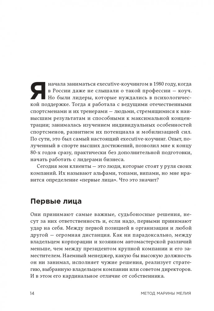Марина Мелия, профессор психологии и коуч-консультант первых лиц российского бизнеса, известна своим уникальным подходом к работе с человеком. Его суть — в глубокой вере в возможности и скрытые силы, которыми обладает абсолютно каждый. Но найти эту силу не всегда просто. Это и есть основная задача коучинга. Автор приглашает читателя в свою профессиональную «мастерскую» и делится секретами своего метода, сложившегося за более чем 50 лет практического консультативного опыта. «За долгие годы практики я перепробовала множество инструментов, отобрала и отшлифовала лучшие, — пишет Марина Мелия. — Сформировались принципы, которыми я руководствуюсь, пришло понимание, какие качества нужно развивать в себе, если стремишься к вершинам мастерства. Все это сложилось в единый авторский метод, секретами которого я и хочу поделиться». Книга будет полезна: ● во-первых, всем, чья деятельность относится к коммуникативным или «помогающим» профессиям, и прежде всего специалистам в области executive-коучинга; ● во-вторых, тем, кто собирается обратиться к коуч-консультанту; ● и, наконец, эта книга для вдумчивого читателя, который не готов останавливаться на достигнутом, думает о своем развитии или просто хочет узнать больше о себе и о других.