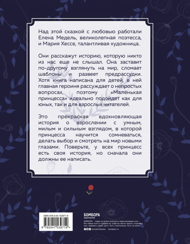 У всех принцесс есть своя история, но сначала они должны ее написать. Принцесса должна покинуть дворец, чтобы найти себе принца, — такую историю мы уже слышали много раз. Сказка перед вами избавлена от классических сюжетов, она написана испанской поэтессой Еленой Медель, а красота рисунков в ней — заслуга художницы Марии Хессе. Несмотря на стиль детской книги, ее героиня рассуждает о непростых вопросах, поэтому «Маленькая принцесса» идеально подойдет для чтения с детьми и вложению истинных ценностей в их будущее обучение. Главная героиня научится сомневаться, выбирать и смотреть на мир новыми глазами. Но сможет ли она написать свой собственный рассказ в конце путешествия? Пусть эта история будет рассказана еще бесчисленное количество раз, чтобы служить образцом для всех сюжетов, которые будут ломать шаблоны и бороться с предрассудками.